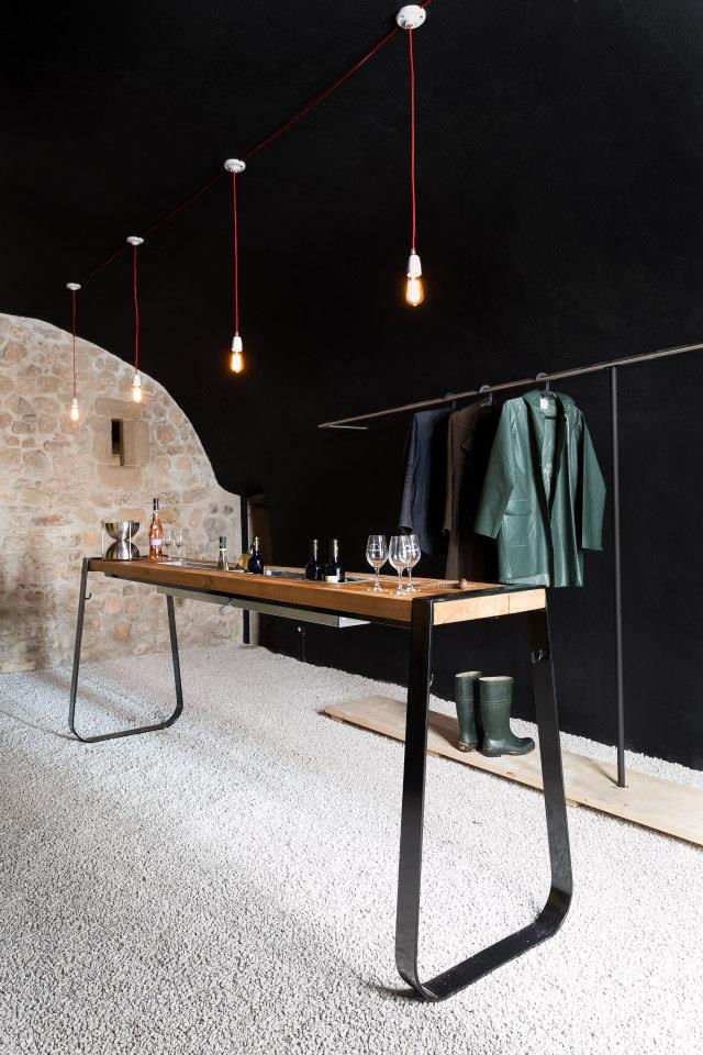 Deux tables de dégustation on été dessinées spécialement pour ce projet. L'utilisation de bois brut et de métal cintré s'inspire directement de l'univers du vigneron